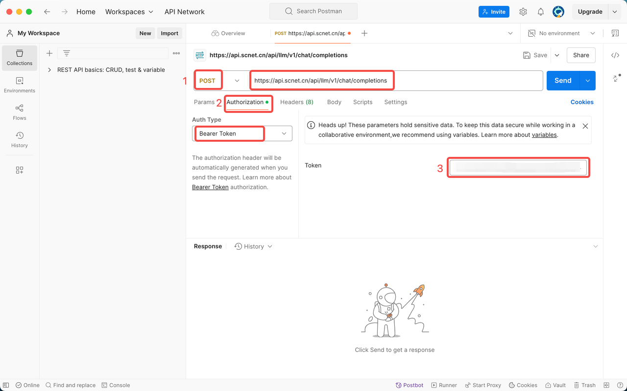 ;Authorization中Auth Type选择“Bearer Token”,在左侧的Token中填写自己的Token。