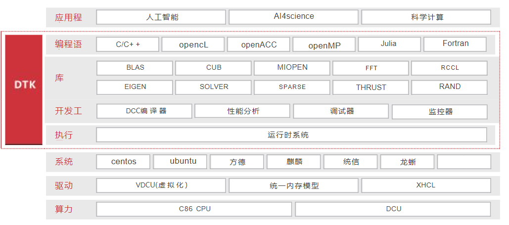 DTK (DCU Toolkit) 集成了DCC(DCU Collect compiler)编译器、经验证和优化的计算库, 支持多种编程语言,同时提供运行、编译、调试和性能分析功能。DTK可兼容主流异构计算生态,致力于让用户只保持一套代码。