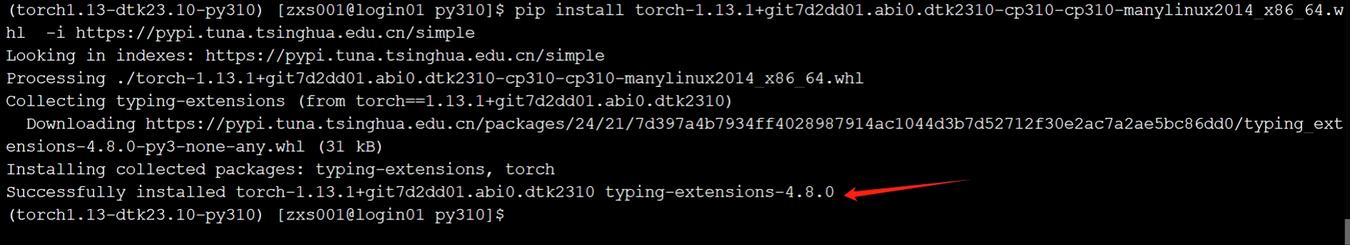pip install torch-1.13.1+git7d2dd01.abi0.dtk2310-cp310-cp310-manylinux2014_x86_64.whl -i https://pypi.tuna.tsinghua.edu.cn/simple #安装需要的torch版本,-i后面是清华镜像源,可以加快安装