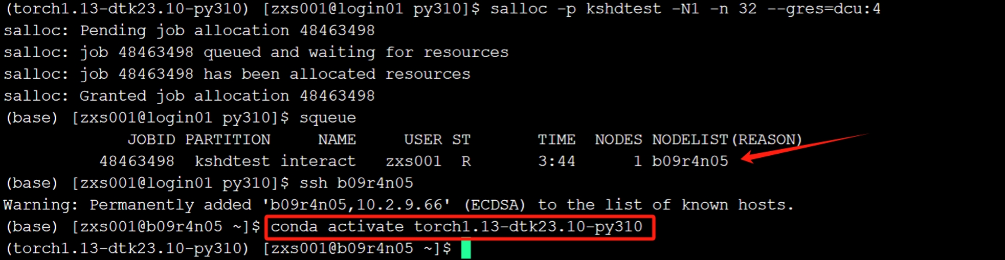 salloc -p kshdtest -N1 -n 32 --gres=dcu:4 #kshdtest表示队列,可以根据whichpartition查看到自己的队列名,带有hd标志的表示dcu队列