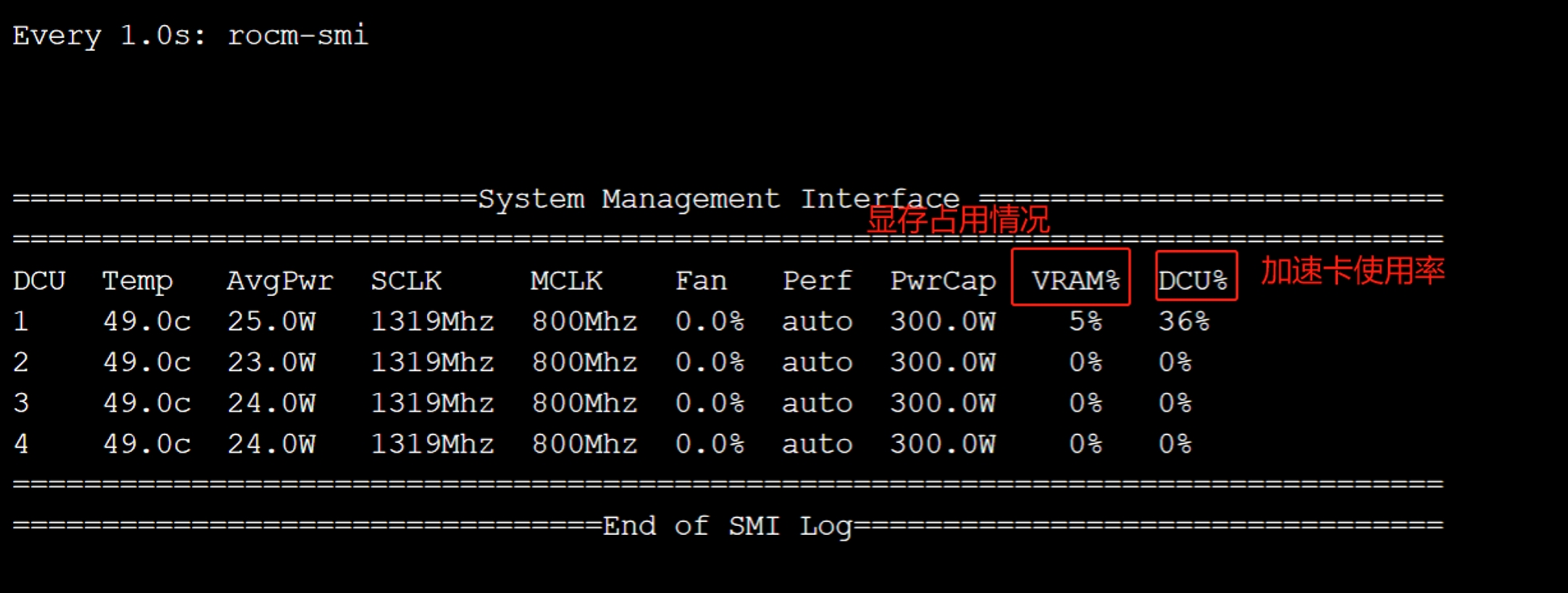 (2)watch -n 1 rocm-smi #每隔一秒刷新一次DCU状态,-n表示几秒刷新一次,如:-n 1 则表示1秒刷新一次;乌镇:watch -n 1 hy-smi