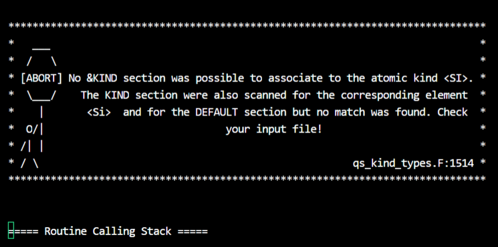 解决思路:这个错误表示输入文件里没有设置 Si 相关的 &KIND 部分,需要重新检查输入文件。