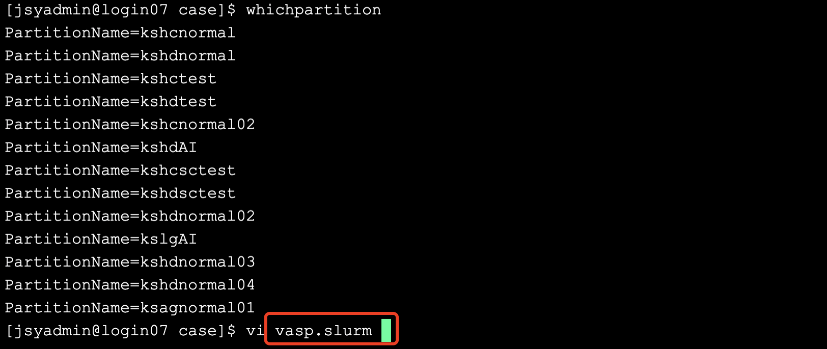 (2)输入whichpartition可以查询可用队列,复制选中合适的队列名称,这里选择了“kshcnormal”,并打开脚本vasp.slurm进行脚本文件的修改。