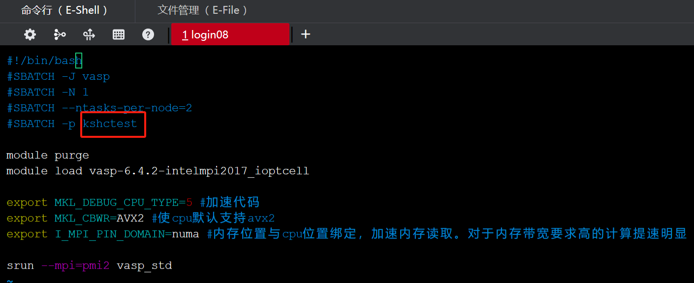 | module load vasp-6.4.2-intelmpi2017_ioptcell | 加载使用的软件以及编译软件使用的环境 |