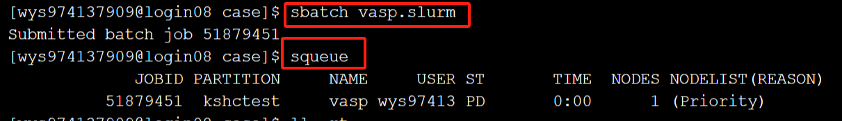 (1)确认环境变量、修改好脚本后保存退出,使用sbatch vasp.slurm提交作业,并通过squeue查看作业的运行状态。