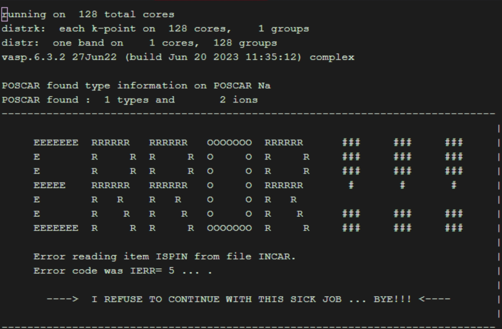(4)vasp NCORE设置不合理报错:cannot subdivide 128 nodes by 5.Fatal error in MPI_topo_test(MPI_COMM_NULL)